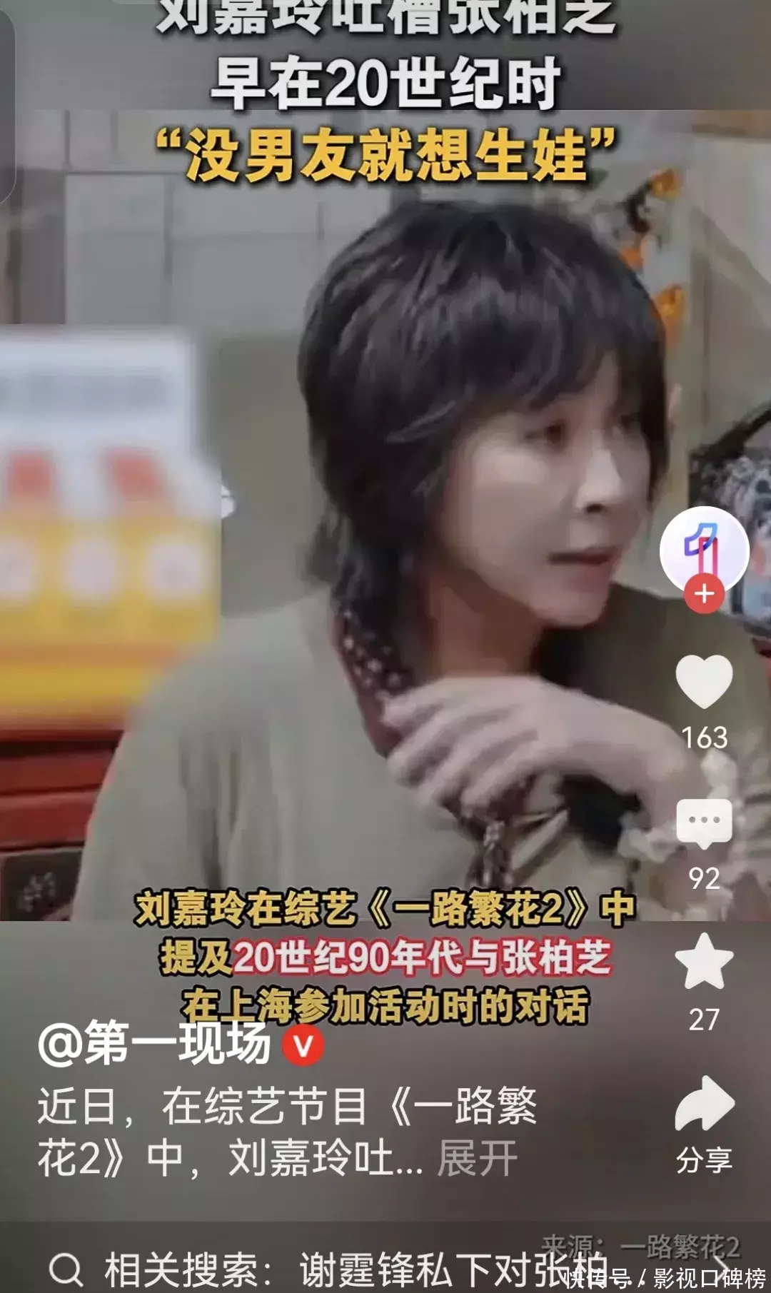 刘嘉玲突然笑着来了一句:哎,我忽然想起柏芝好多年前说过一句话。很多年前在上海,张柏芝还没结婚,连个正经男朋友都没有。她就那么直直地看着我,特别认真地说:嘉玲姐,我不喜欢恋爱,我只想要小孩。刘嘉玲说当时就愣住了,直接问:你男朋友都没有,怎么生啊?